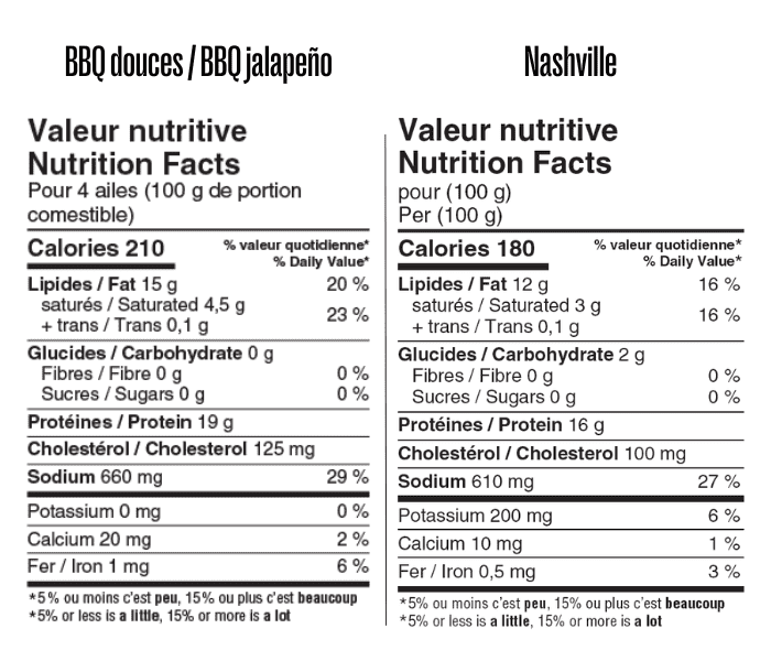 Ingrédients ailes BBQ douces : Ailes de Poulet, Eau, Épices à poulet crapaudine (Sel, Paprika, Cassonade, Protéine hydrolysée de maïs, Sucre, Assaisonnement chili Mexicain, Épices, Légumes déshydrates, Glutamate monosodique, Huile de canola), Phosphate de sodium, Amidon de maïs modifié, Extrait paprika sur sel (Epices, Sel de mer, Saveur).